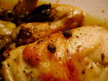 Bake for one hour, basting occasionally. Remove chicken pieces to serving platter. Defat juices if necessary, and pour over chicken. Arrange prunes and olives around chicken.